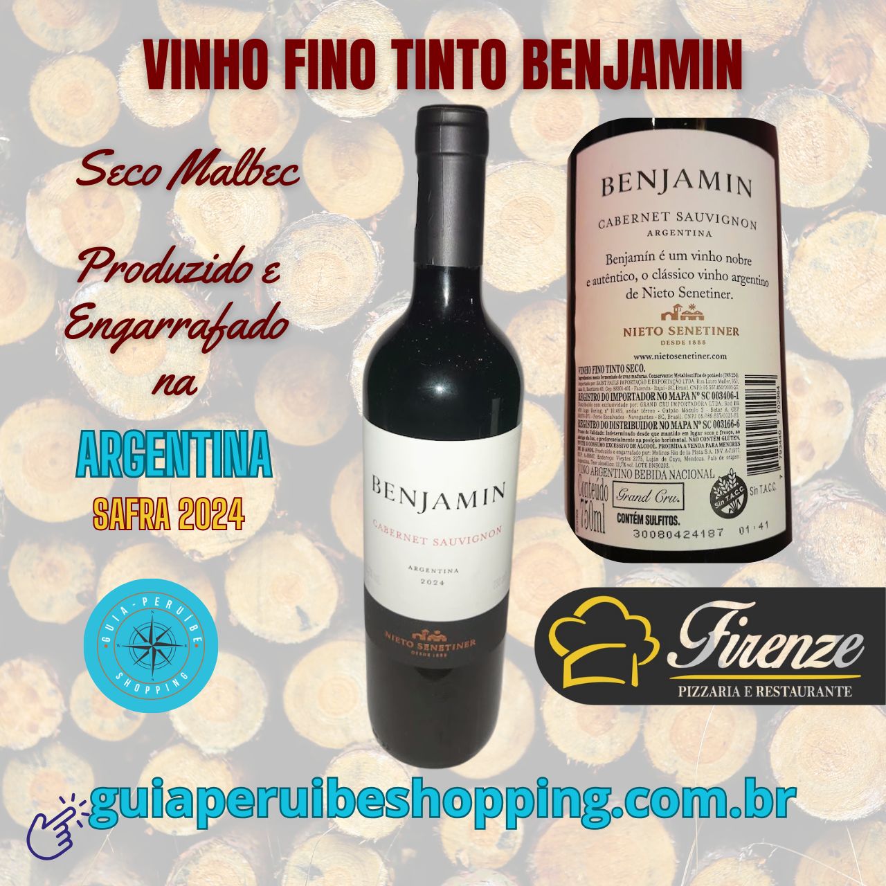 Em Peruíbe a Pizzaria e Restaurante Firenze, tem em sua adega, o vinho fino tinto seco de mesa Argentino Benjamin Cabernet Sauvignon Reserva 2024. É um vinho ideal para acompanhar a autenticidade de cada momento, a vida inteira. Coloração rubi intenso, aromas de especiarias e frutas vermelhas como a groselha. Sua temperatura ideal de consumo é de 16º a 18ºC..