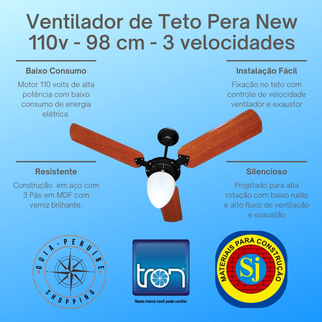 O ventilador e exaustor de Teto Pera New preto 110v Tron 96 cm possui lustre para uma lâmpada e tamanho ideal para oferecer muita Ventilação ou exaustão. Além de ter um visual bem moderno e muitas outras qualidade, ele é muito fácil de montar e desmontar para limpar. O ventilador da Tron possui um motor muito potente de 130W com muita força e com excelente eficiência energética, o que resulta em um produto forte e econômico.Construido em Aço carbono e MDF envernizado de alta resistência, leve e muito prático para limpar.